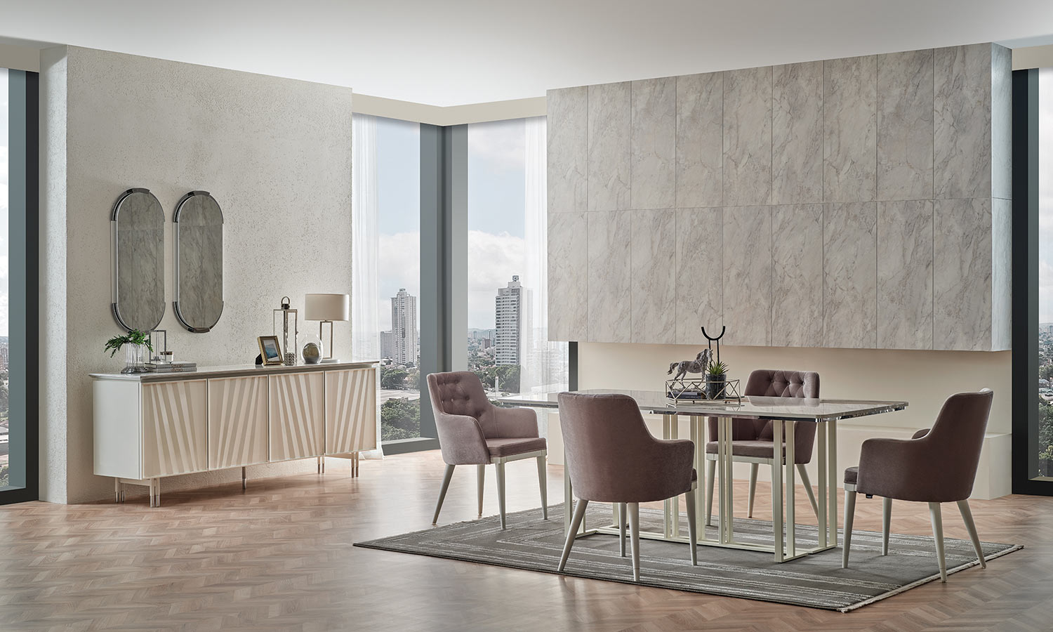 Stylish and Elegant Details The Albero Pearl Dining Room presents a modern and elegant design with its three-dimensional special pattern application, harmonizing metal and marble. The marble-patterned application on the wooden-legged fixed and extendable table options adds sophistication to the series while catering to various spaces and needs. The chrome-detailed mirror design complements the collection's elegance, giving your living space a luxurious look