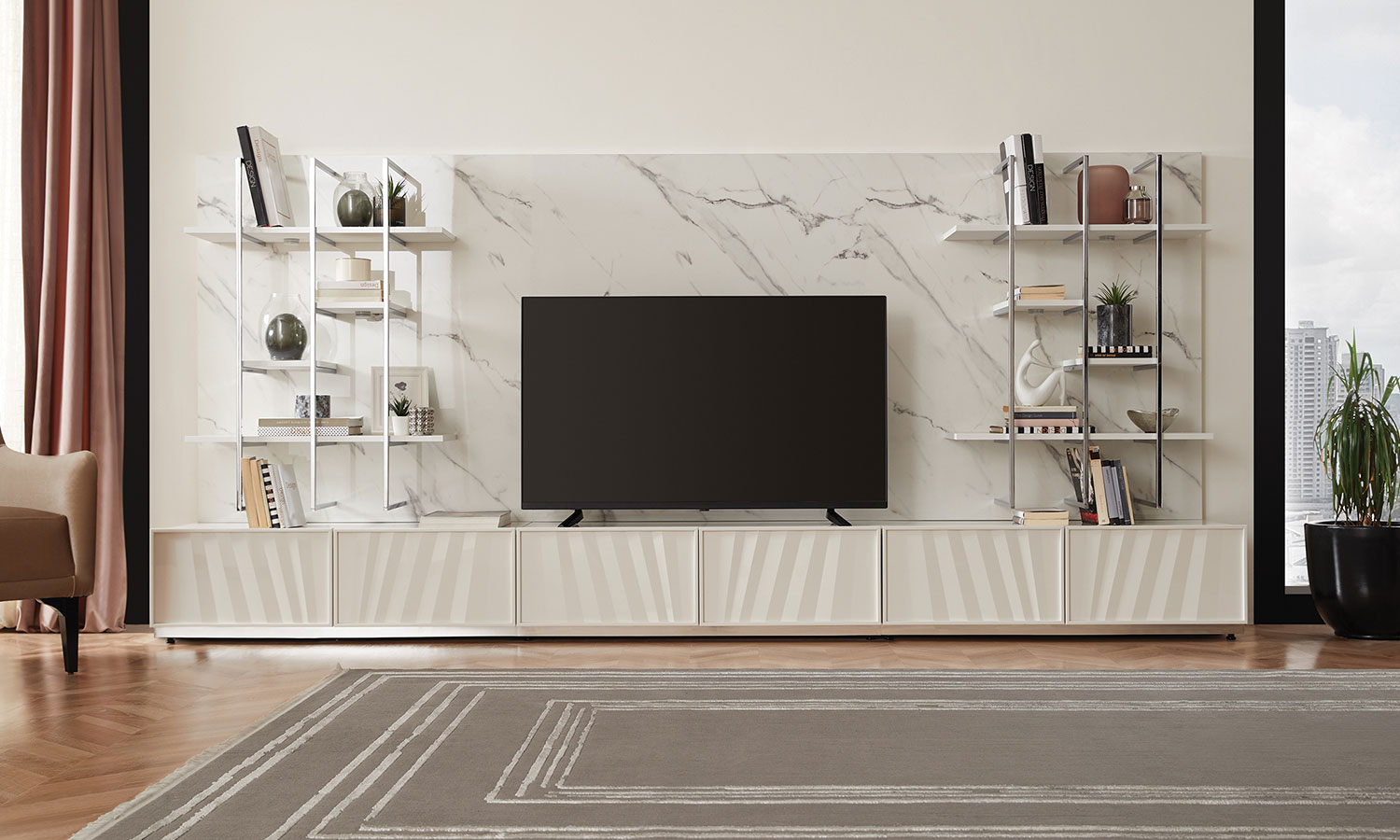 Magnificent Harmony" The combined use of metal and marble pattern creates an elegant harmony, offering the possibility of various combinations with its rich module variety. Albero Pearl TV Unit completes its handle-free, simple and stylish look on TV stands with a three-dimensional special pattern application on the drawer front panels. The open-shelf upper module illuminates your living space with daylight spotlights.