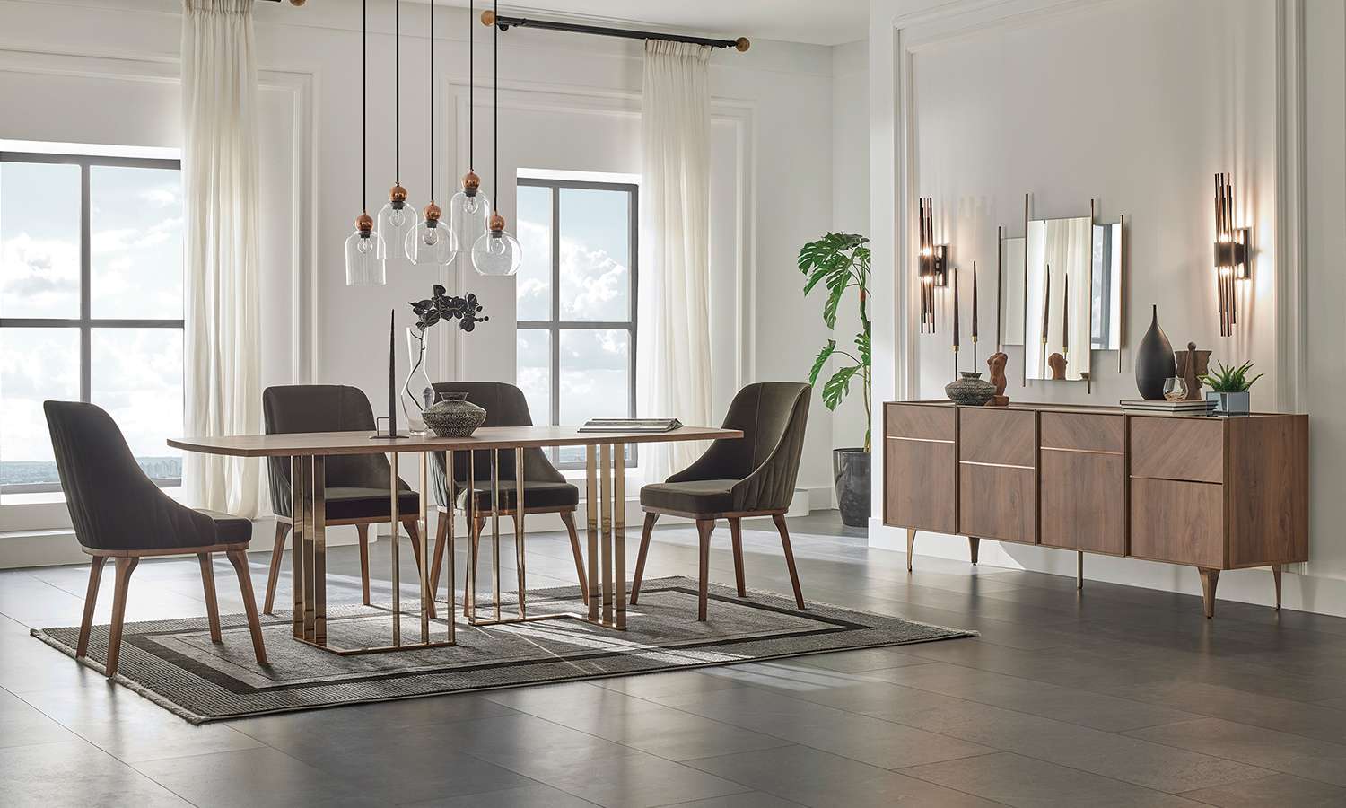 Splendid Addition to Dining Tables The Ribera Series brings simple and warm textures to your living space, offering a unique interpretation of bronze and walnut tones. Completing the series with its marble-look top layer on the console and a rectangular-shaped mirror detailed with metal accents. The bronze strip details on the door applications provide a modern look, while the handleless cabinet design adds aesthetic elegance. Featuring two different dining table options—metal-legged fixed and extendable—it offers functional use and completes its aesthetic appearance with two different chair alternatives to accompany your special gatherings. The Ribera Dining Room, merging wood and captivating details with marble texture, will transform your living room into an exclusive space.