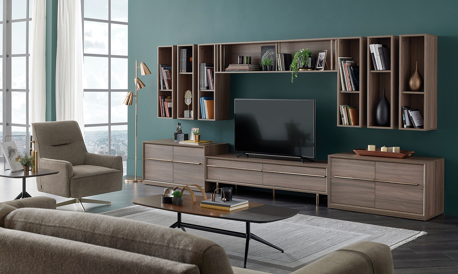 Lukka TV Unit, offering the enchanting contrast of wood and metal, brings life to the corner it resides in. It complements its style with a unified look and a modular TV unit, completing its elegance with functionality. Providing functional use with three different TV Stand alternatives and offering multiple combinations thanks to its module variety. With its bronze metal legs and coordinated handle design, Lukka TV Unit achieves an elegant and luxurious appearance, becoming the most eye-catching corner of your living space.