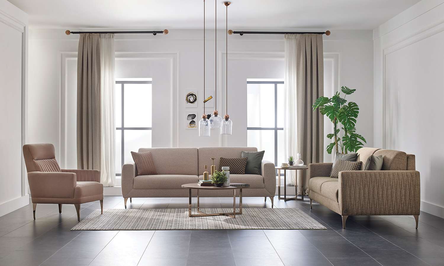 With minimal touches and high comfort, the Ribera Sofa Set brings simple and warm textures to your living space, introducing a unique style to your home with its distinctive design lines and functionality. The specially designed fabric combinations provide a modern look, while the delicate stitching details on the arm sides complement its linear lines. The 3-seater sofa, with a backward-moving back mechanism, easily transforms into a bed, offering your guests both elegance and comfortable sleep. The elegant coffee table design with bronze metal legs complements the series, enhancing the craftsmanship and aesthetic presence to redefine your living space.